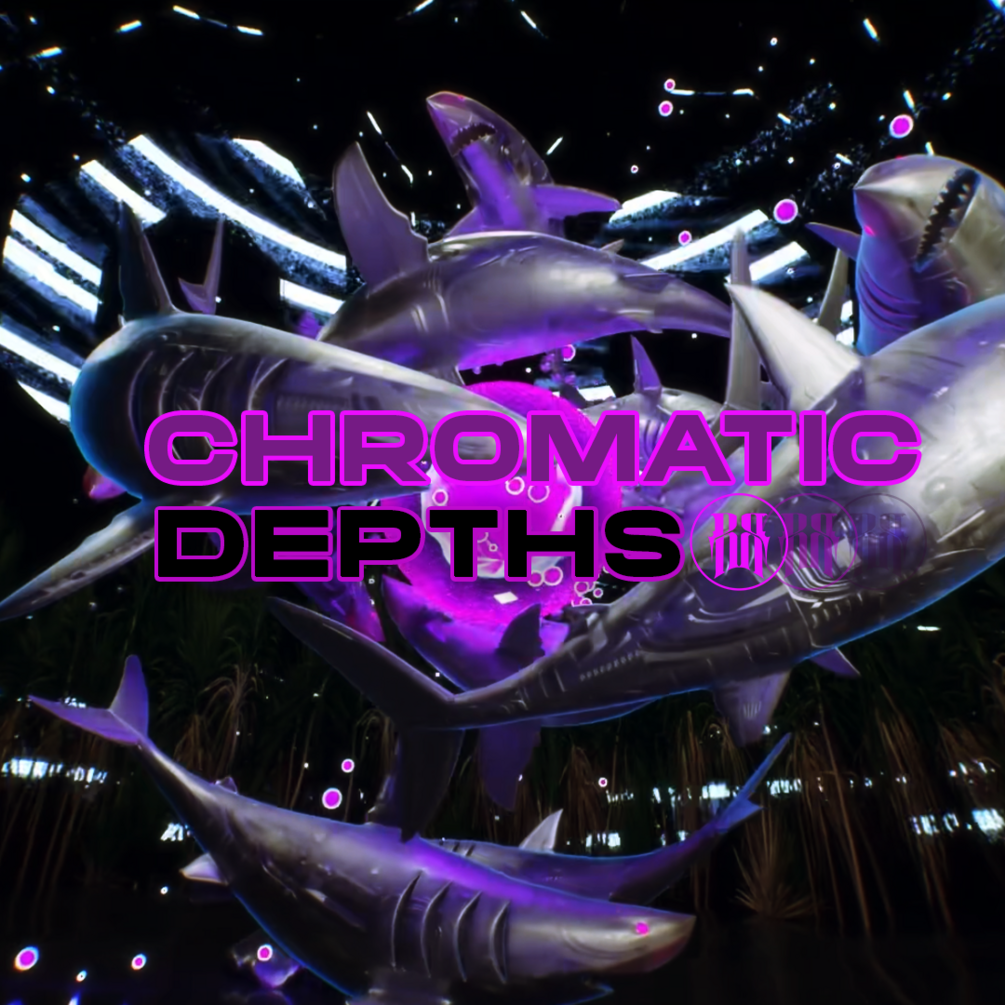 The sound design is immersive—a mix of deep synth drones, glitching static, and the hum of unseen machinery. Each shark glides through the airless void with an unnatural smoothness, their metallic bodies refracting shards of color like liquid mirrors. Occasionally, they flicker, phasing in and out of existence, as if struggling to maintain their form in this digital limbo.